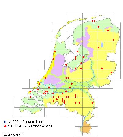 Het aantal atlasblokken (5x5 km) waarin de soort is gemeld binnen een periode van vijf jaar (vanaf 1980) of twintig jaar. Niet gecorrigeerd voor waarnemersinspanning en het aantal doorgegeven waarnemingen kan sterk variëren per periode, dus een trend in verspreiding kan hier niet direct uit worden afgelezen. Het opgegeven jaartal is het eerste jaar van de periode. Bron: gevalideerde waarnemingen uit de NDFF.