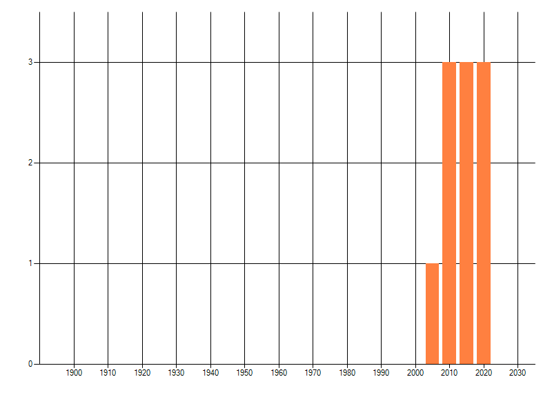 Het aantal atlasblokken (5x5 km) waarin de soort is gemeld binnen een periode van vijf jaar (vanaf 1980) of twintig jaar. Niet gecorrigeerd voor waarnemersinspanning en het aantal doorgegeven waarnemingen kan sterk variëren per periode, dus een trend in verspreiding kan hier niet direct uit worden afgelezen. Het opgegeven jaartal is het eerste jaar van de periode. Bron: gevalideerde waarnemingen uit de NDFF.