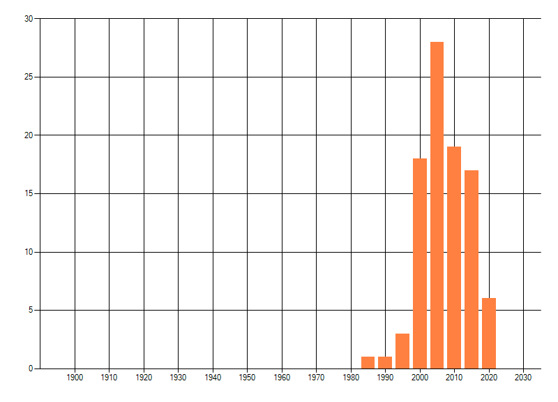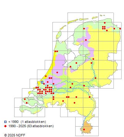 Het aantal atlasblokken (5x5 km) waarin de soort is gemeld binnen een periode van vijf jaar (vanaf 1980) of twintig jaar. Niet gecorrigeerd voor waarnemersinspanning en het aantal doorgegeven waarnemingen kan sterk variëren per periode, dus een trend in verspreiding kan hier niet direct uit worden afgelezen. Het opgegeven jaartal is het eerste jaar van de periode. Bron: gevalideerde waarnemingen uit de NDFF.