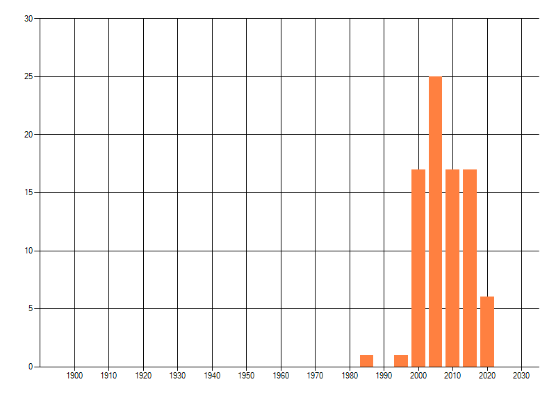 Het aantal atlasblokken (5x5 km) waarin de soort is gemeld binnen een periode van vijf jaar (vanaf 1980) of twintig jaar. Niet gecorrigeerd voor waarnemersinspanning en het aantal doorgegeven waarnemingen kan sterk variëren per periode, dus een trend in verspreiding kan hier niet direct uit worden afgelezen. Het opgegeven jaartal is het eerste jaar van de periode. Bron: gevalideerde waarnemingen uit de NDFF.