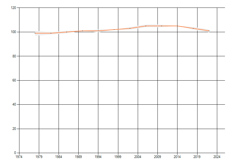 Gemiddelde trend van het aantal kilometerhokken waarin de soort voorkomt, weergegeven als indexcijfer (1975-1978 = 100).