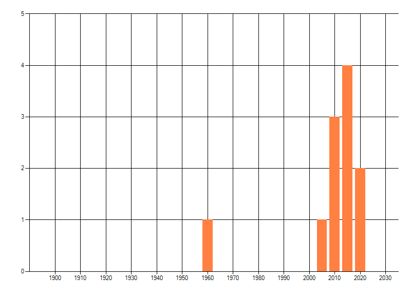 Het aantal atlasblokken (5x5 km) waarin de soort is gemeld binnen een periode van vijf jaar (vanaf 1980) of twintig jaar. Niet gecorrigeerd voor waarnemersinspanning en het aantal doorgegeven waarnemingen kan sterk variëren per periode, dus een trend in verspreiding kan hier niet direct uit worden afgelezen. Het opgegeven jaartal is het eerste jaar van de periode. Bron: gevalideerde waarnemingen uit de NDFF.