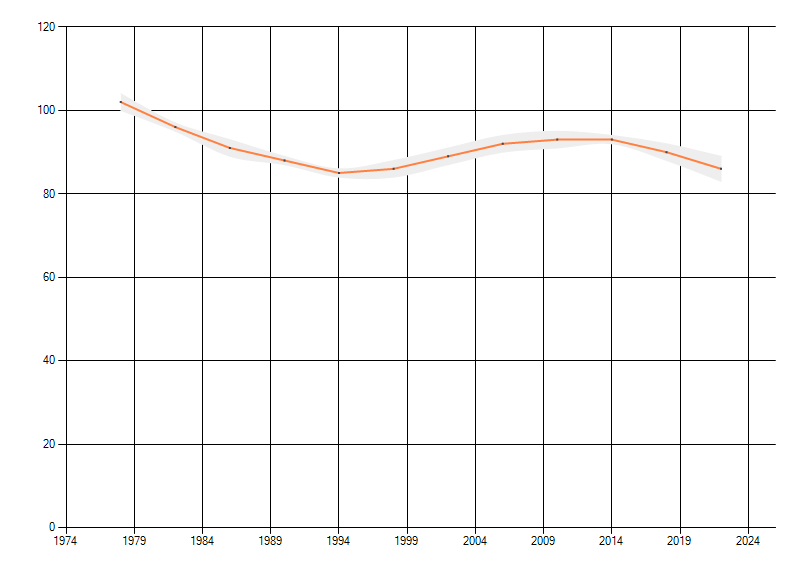Gemiddelde trend van het aantal kilometerhokken waarin de soort voorkomt, weergegeven als indexcijfer (1975-1978 = 100).