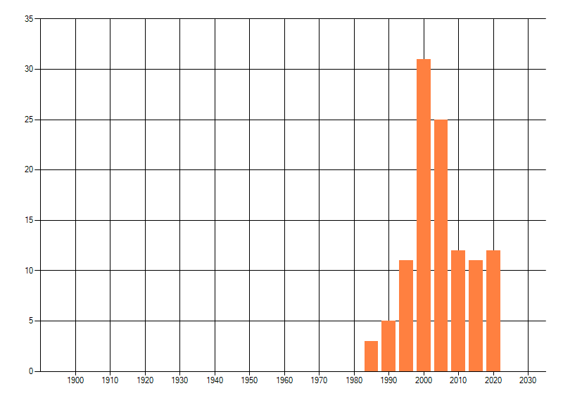 Het aantal atlasblokken (5x5 km) waarin de soort is gemeld binnen een periode van vijf jaar (vanaf 1980) of twintig jaar.