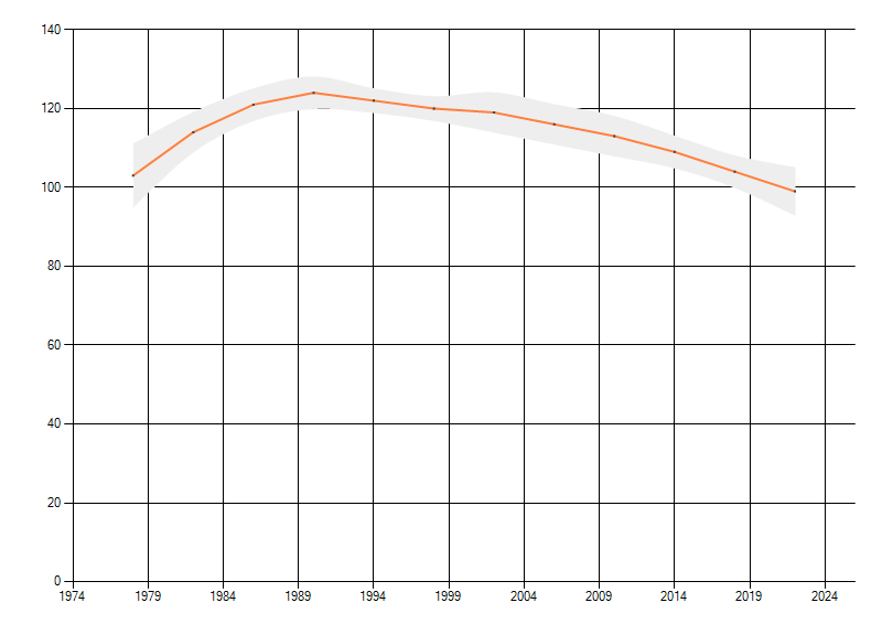 Gemiddelde trend van het aantal kilometerhokken waarin de soort voorkomt, weergegeven als indexcijfer (1975-1978 = 100). De trend is gecorrigeerd voor waarnemersinspanning en geeft de relatieve verandering in het aantal bezette kilometerhokken weer. Voor de berekening worden de data per periode van vier jaar samengenomen. In de grafiek correspondeert ieder punt met het laatste jaar van zo'n periode.