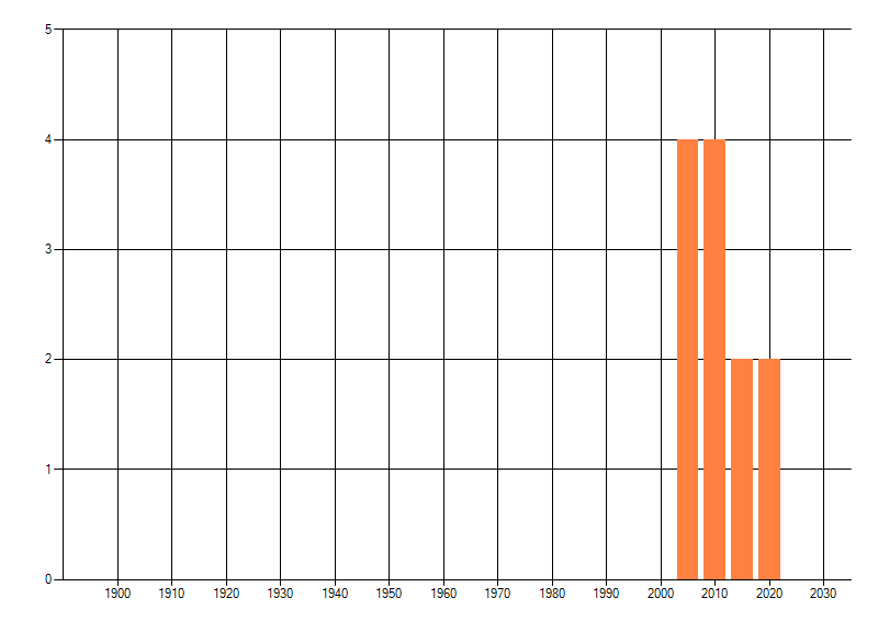 Het aantal atlasblokken (5x5 km) waarin de soort is gemeld binnen een periode van vijf jaar (vanaf 1980) of twintig jaar. Niet gecorrigeerd voor waarnemersinspanning en het aantal doorgegeven waarnemingen kan sterk variëren per periode, dus een trend in verspreiding kan hier niet direct uit worden afgelezen. Het opgegeven jaartal is het eerste jaar van de periode. Bron: gevalideerde waarnemingen uit de NDFF.
