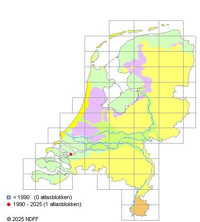 Het aantal atlasblokken (5x5 km) waarin de soort is gemeld binnen een periode van vijf jaar (vanaf 1980) of twintig jaar. Niet gecorrigeerd voor waarnemersinspanning en het aantal doorgegeven waarnemingen kan sterk variëren per periode, dus een trend in verspreiding kan hier niet direct uit worden afgelezen. Het opgegeven jaartal is het eerste jaar van de periode. Bron: gevalideerde waarnemingen uit de NDFF.