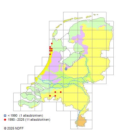 Het aantal atlasblokken (5x5 km) waarin de soort is gemeld binnen een periode van vijf jaar (vanaf 1980) of twintig jaar.