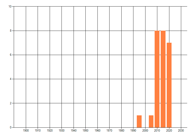 Het aantal atlasblokken (5x5 km) waarin de soort is gemeld binnen een periode van vijf jaar (vanaf 1980) of twintig jaar. Niet gecorrigeerd voor waarnemersinspanning en het aantal doorgegeven waarnemingen kan sterk variëren per periode, dus een trend in verspreiding kan hier niet direct uit worden afgelezen. Het opgegeven jaartal is het eerste jaar van de periode. Bron: gevalideerde waarnemingen uit de NDFF.