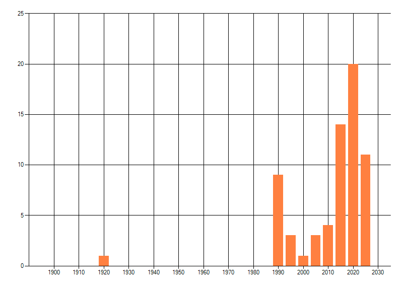 Het aantal atlasblokken (5x5 km) waarin de soort is gemeld binnen een periode van vijf jaar (vanaf 1980) of twintig jaar. Niet gecorrigeerd voor waarnemersinspanning en het aantal doorgegeven waarnemingen kan sterk variëren per periode, dus een trend in verspreiding kan hier niet direct uit worden afgelezen. Het opgegeven jaartal is het eerste jaar van de periode. Bron: gevalideerde waarnemingen uit de NDFF.