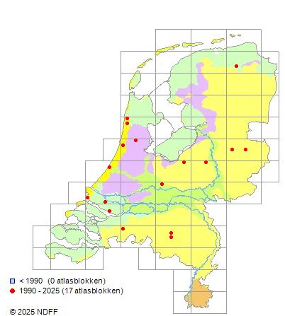 Het aantal atlasblokken (5x5 km) waarin de soort is gemeld binnen een periode van vijf jaar (vanaf 1980) of twintig jaar. Niet gecorrigeerd voor waarnemersinspanning en het aantal doorgegeven waarnemingen kan sterk variëren per periode, dus een trend in verspreiding kan hier niet direct uit worden afgelezen. Het opgegeven jaartal is het eerste jaar van de periode. Bron: gevalideerde waarnemingen uit de NDFF.