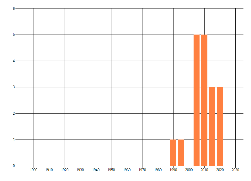 Het aantal atlasblokken (5x5 km) waarin de soort is gemeld binnen een periode van vijf jaar (vanaf 1980) of twintig jaar. Niet gecorrigeerd voor waarnemersinspanning en het aantal doorgegeven waarnemingen kan sterk variëren per periode, dus een trend in verspreiding kan hier niet direct uit worden afgelezen. Het opgegeven jaartal is het eerste jaar van de periode. Bron: gevalideerde waarnemingen uit de NDFF.