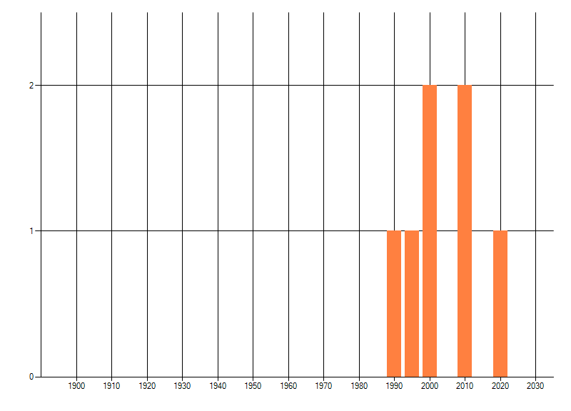 Het aantal atlasblokken (5x5 km) waarin de soort is gemeld binnen een periode van vijf jaar (vanaf 1980) of twintig jaar. Niet gecorrigeerd voor waarnemersinspanning en het aantal doorgegeven waarnemingen kan sterk variëren per periode, dus een trend in verspreiding kan hier niet direct uit worden afgelezen. Het opgegeven jaartal is het eerste jaar van de periode. Bron: gevalideerde waarnemingen uit de NDFF.