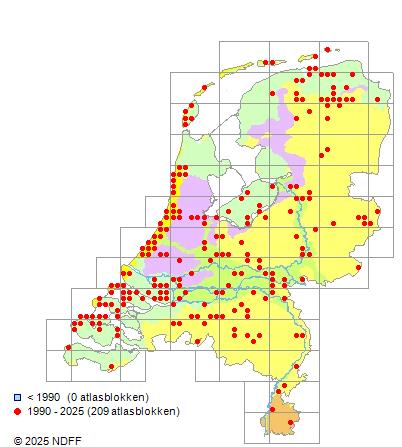 Het aantal atlasblokken (5x5 km) waarin de soort is gemeld binnen een periode van vijf jaar (vanaf 1980) of twintig jaar.