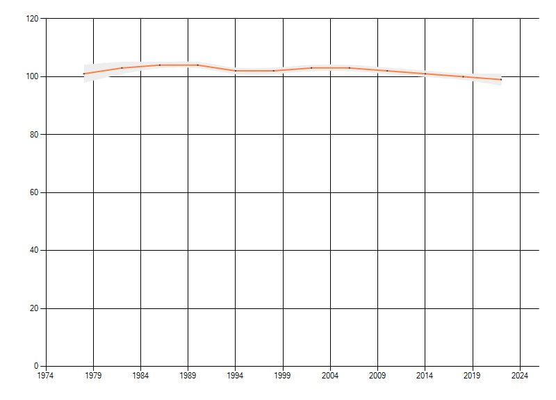 Gemiddelde trend van het aantal kilometerhokken waarin de soort voorkomt, weergegeven als indexcijfer (1975-1978 = 100).