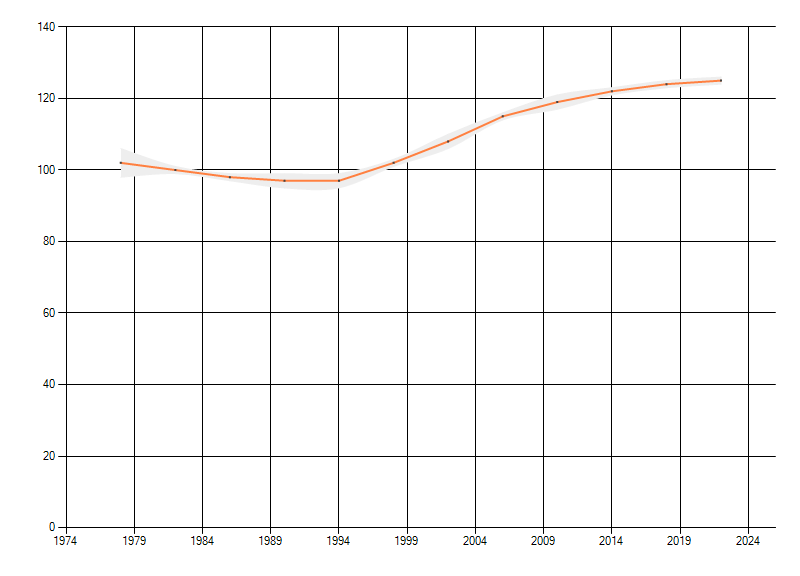 Gemiddelde trend van het aantal kilometerhokken waarin de soort voorkomt, weergegeven als indexcijfer (1975-1978 = 100).