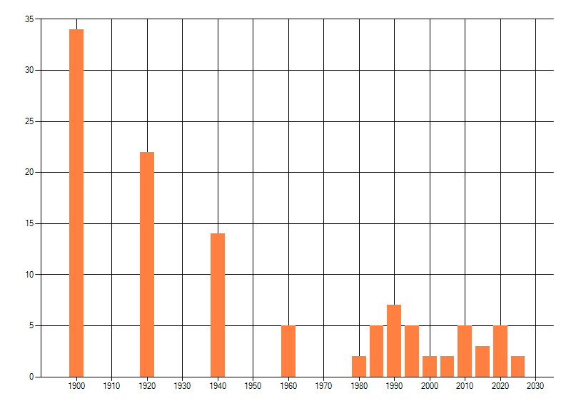 Het aantal atlasblokken (5x5 km) waarin de soort is gemeld binnen een periode van vijf jaar (vanaf 1980) of twintig jaar. Niet gecorrigeerd voor waarnemersinspanning en het aantal doorgegeven waarnemingen kan sterk variëren per periode, dus een trend in verspreiding kan hier niet direct uit worden afgelezen. Het opgegeven jaartal is het eerste jaar van de periode. Bron: gevalideerde waarnemingen uit de NDFF.