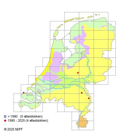 Het aantal atlasblokken (5x5 km) waarin de soort is gemeld binnen een periode van vijf jaar (vanaf 1980) of twintig jaar. Niet gecorrigeerd voor waarnemersinspanning en het aantal doorgegeven waarnemingen kan sterk variëren per periode, dus een trend in verspreiding kan hier niet direct uit worden afgelezen. Het opgegeven jaartal is het eerste jaar van de periode. Bron: gevalideerde waarnemingen uit de NDFF.