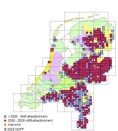 CC BY-NC-SA 3.0 NLVerspreidingNederlandPlaatselijk vrij algemeen in het oosten en midden van het land en vrij zeldzaam in Zuid-Limburg. Elders zeer zeldzaam, o.a. in de Hollandse duinen. Niet in Zeeland, het noordelijk zeekleigebied, op de Waddeneilanden en in Flevoland.
