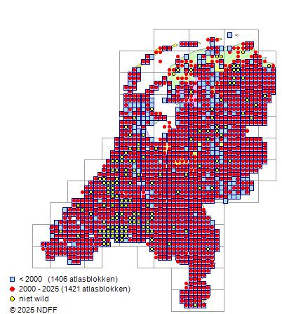De trend is gecorrigeerd voor waarnemersinspanning en geeft de relatieve verandering in het aantal bezette kilometerhokken weer.
