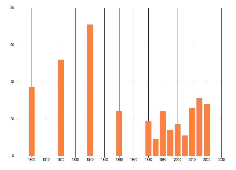 Het aantal atlasblokken (5x5 km) waarin de soort is gemeld binnen een periode van vijf jaar (vanaf 1980) of twintig jaar. Niet gecorrigeerd voor waarnemersinspanning en het aantal doorgegeven waarnemingen kan sterk variëren per periode, dus een trend in verspreiding kan hier niet direct uit worden afgelezen. Het opgegeven jaartal is het eerste jaar van de periode. Bron: gevalideerde waarnemingen uit de NDFF.