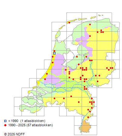 Het aantal atlasblokken (5x5 km) waarin de soort is gemeld binnen een periode van vijf jaar (vanaf 1980) of twintig jaar. Niet gecorrigeerd voor waarnemersinspanning en het aantal doorgegeven waarnemingen kan sterk variëren per periode, dus een trend in verspreiding kan hier niet direct uit worden afgelezen. Het opgegeven jaartal is het eerste jaar van de periode. Bron: gevalideerde waarnemingen uit de NDFF.