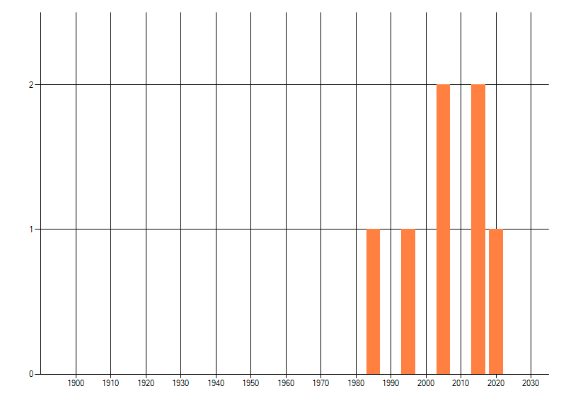 Het aantal atlasblokken (5x5 km) waarin de soort is gemeld binnen een periode van vijf jaar (vanaf 1980) of twintig jaar. Niet gecorrigeerd voor waarnemersinspanning en het aantal doorgegeven waarnemingen kan sterk variëren per periode, dus een trend in verspreiding kan hier niet direct uit worden afgelezen. Het opgegeven jaartal is het eerste jaar van de periode. Bron: gevalideerde waarnemingen uit de NDFF.