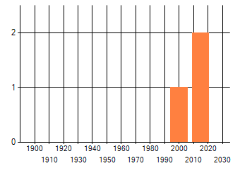 Het aantal atlasblokken (5x5 km) waarin de soort is gemeld binnen een periode van vijf jaar (vanaf 1980) of twintig jaar. Niet gecorrigeerd voor waarnemersinspanning en het aantal doorgegeven waarnemingen kan sterk variëren per periode, dus een trend in verspreiding kan hier niet direct uit worden afgelezen. Het opgegeven jaartal is het eerste jaar van de periode. Bron: gevalideerde waarnemingen uit de NDFF.