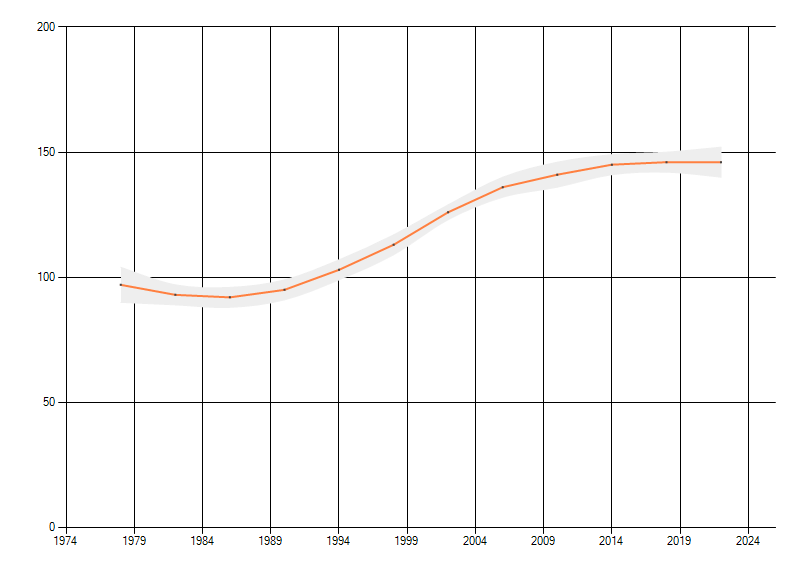 Gemiddelde trend van het aantal kilometerhokken waarin de soort voorkomt, weergegeven als indexcijfer (1975-1978 = 100).