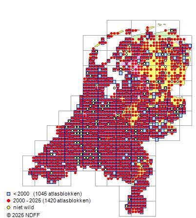 CC BY-NC-SA 3.0 NLVerspreidingNederlandVrij algemeen, het meest in stedelijke omgeving. Vrij zeldzaam in Gelderland, in het oosten en het noordoosten en zeldzaam op de Waddeneilanden.
