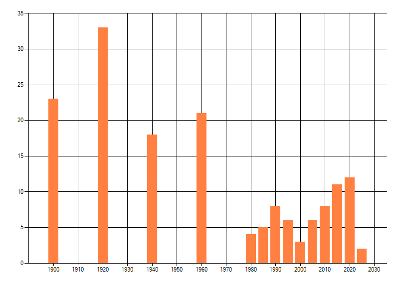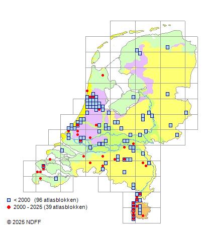 Het aantal atlasblokken (5x5 km) waarin de soort is gemeld binnen een periode van vijf jaar (vanaf 1980) of twintig jaar. Niet gecorrigeerd voor waarnemersinspanning en het aantal doorgegeven waarnemingen kan sterk variëren per periode, dus een trend in verspreiding kan hier niet direct uit worden afgelezen. Het opgegeven jaartal is het eerste jaar van de periode. Bron: gevalideerde waarnemingen uit de NDFF.