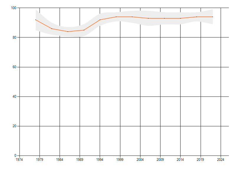 Gemiddelde trend van het aantal kilometerhokken waarin de soort voorkomt, weergegeven als indexcijfer (1975-1978 = 100).