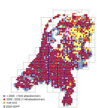 CC BY-NC-SA 3.0 NLVerspreidingNederlandVrij algemeen. Het meest in stedelijke omgeving. Vrij zeldzaam in Gelderland, Overijssel, Drenthe, Fryslân en Groningen en zeldzaam op de Waddeneilanden.