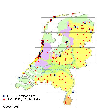 Het aantal atlasblokken (5x5 km) waarin de soort is gemeld binnen een periode van vijf jaar (vanaf 1980) of twintig jaar. Niet gecorrigeerd voor waarnemersinspanning en het aantal doorgegeven waarnemingen kan sterk variëren per periode, dus een trend in verspreiding kan hier niet direct uit worden afgelezen. Het opgegeven jaartal is het eerste jaar van de periode. Bron: gevalideerde waarnemingen uit de NDFF.