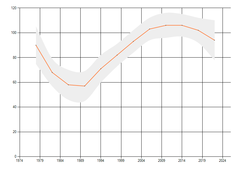 Gemiddelde trend van het aantal kilometerhokken waarin de soort voorkomt, weergegeven als indexcijfer (1975-1978 = 100). De trend is gecorrigeerd voor waarnemersinspanning en geeft de relatieve verandering in het aantal bezette kilometerhokken weer. Voor de berekening worden de data per periode van vier jaar samengenomen. In de grafiek correspondeert ieder punt met het laatste jaar van zo'n periode.