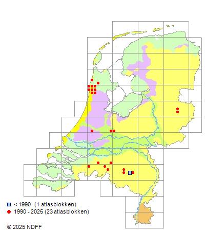 Het aantal atlasblokken (5x5 km) waarin de soort is gemeld binnen een periode van vijf jaar (vanaf 1980) of twintig jaar. Niet gecorrigeerd voor waarnemersinspanning en het aantal doorgegeven waarnemingen kan sterk variëren per periode, dus een trend in verspreiding kan hier niet direct uit worden afgelezen. Het opgegeven jaartal is het eerste jaar van de periode. Bron: gevalideerde waarnemingen uit de NDFF.