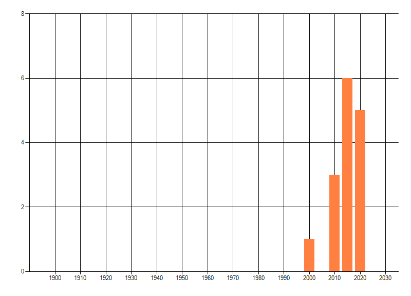 Het aantal atlasblokken (5x5 km) waarin de soort is gemeld binnen een periode van vijf jaar (vanaf 1980) of twintig jaar. Niet gecorrigeerd voor waarnemersinspanning en het aantal doorgegeven waarnemingen kan sterk variëren per periode, dus een trend in verspreiding kan hier niet direct uit worden afgelezen. Het opgegeven jaartal is het eerste jaar van de periode. Bron: gevalideerde waarnemingen uit de NDFF.