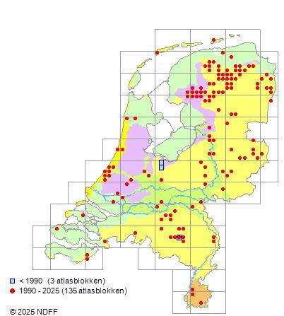 Het aantal atlasblokken (5x5 km) waarin de soort is gemeld binnen een periode van vijf jaar (vanaf 1980) of twintig jaar. Niet gecorrigeerd voor waarnemersinspanning en het aantal doorgegeven waarnemingen kan sterk variëren per periode, dus een trend in verspreiding kan hier niet direct uit worden afgelezen. Het opgegeven jaartal is het eerste jaar van de periode. Bron: gevalideerde waarnemingen uit de NDFF.