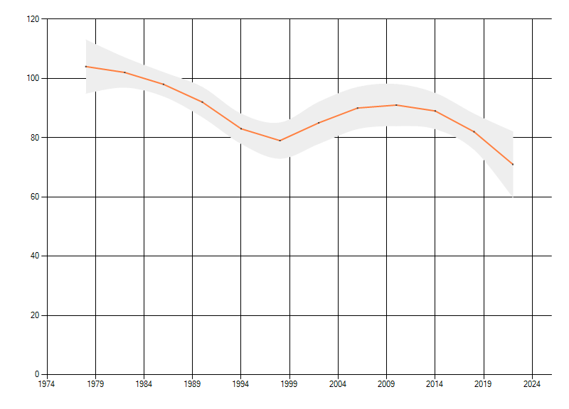Gemiddelde trend van het aantal kilometerhokken waarin de soort voorkomt, weergegeven als indexcijfer (1975-1978 = 100).