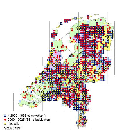 CC BY-NC-SA 3.0 NLVerspreidingNederlandPlaatselijk vrij algemeen in laagveengebieden en vrij zeldzaam in het noordoosten van het land. Elders zeldzaam, maar zeer zeldzaam in Zuid-Limburg. Niet in Zeeland en Flevoland.