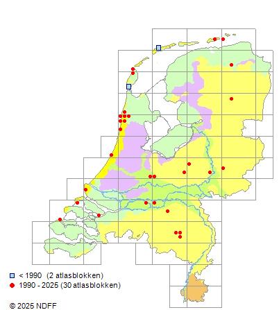 Het aantal atlasblokken (5x5 km) waarin de soort is gemeld binnen een periode van vijf jaar (vanaf 1980) of twintig jaar.