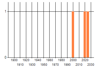 Het aantal atlasblokken (5x5 km) waarin de soort is gemeld binnen een periode van vijf jaar (vanaf 1980) of twintig jaar. Niet gecorrigeerd voor waarnemersinspanning en het aantal doorgegeven waarnemingen kan sterk variëren per periode, dus een trend in verspreiding kan hier niet direct uit worden afgelezen. Het opgegeven jaartal is het eerste jaar van de periode. Bron: gevalideerde waarnemingen uit de NDFF.