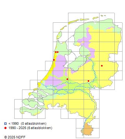 Het aantal atlasblokken (5x5 km) waarin de soort is gemeld binnen een periode van vijf jaar (vanaf 1980) of twintig jaar. Niet gecorrigeerd voor waarnemersinspanning en het aantal doorgegeven waarnemingen kan sterk variëren per periode, dus een trend in verspreiding kan hier niet direct uit worden afgelezen. Het opgegeven jaartal is het eerste jaar van de periode. Bron: gevalideerde waarnemingen uit de NDFF.