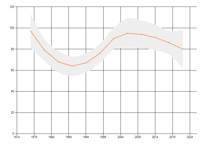 Gemiddelde trend van het aantal kilometerhokken waarin de soort voorkomt, weergegeven als indexcijfer (1975-1978 = 100). De trend is gecorrigeerd voor waarnemersinspanning en geeft de relatieve verandering in het aantal bezette kilometerhokken weer. Voor de berekening worden de data per periode van vier jaar samengenomen. In de grafiek correspondeert ieder punt met het laatste jaar van zo'n periode.
