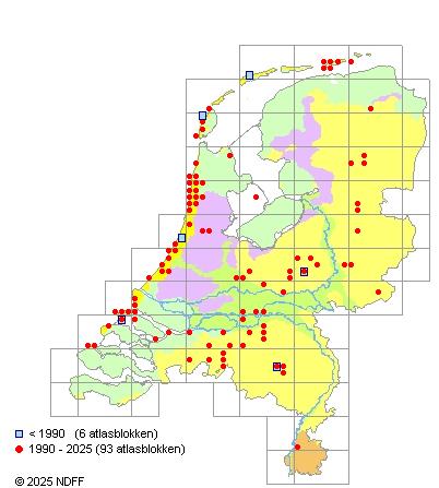 Het aantal atlasblokken (5x5 km) waarin de soort is gemeld binnen een periode van vijf jaar (vanaf 1980) of twintig jaar. Niet gecorrigeerd voor waarnemersinspanning en het aantal doorgegeven waarnemingen kan sterk variëren per periode, dus een trend in verspreiding kan hier niet direct uit worden afgelezen. Het opgegeven jaartal is het eerste jaar van de periode. Bron: gevalideerde waarnemingen uit de NDFF.