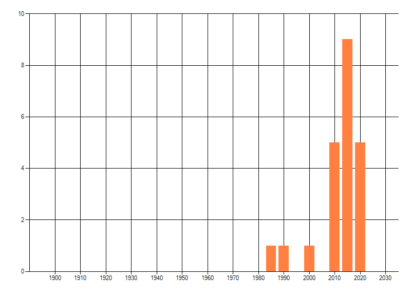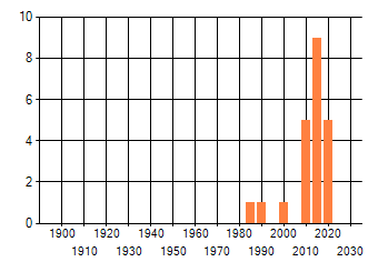 Het aantal atlasblokken (5x5 km) waarin de soort is gemeld binnen een periode van vijf jaar (vanaf 1980) of twintig jaar. Niet gecorrigeerd voor waarnemersinspanning en het aantal doorgegeven waarnemingen kan sterk variëren per periode, dus een trend in verspreiding kan hier niet direct uit worden afgelezen. Het opgegeven jaartal is het eerste jaar van de periode. Bron: gevalideerde waarnemingen uit de NDFF.