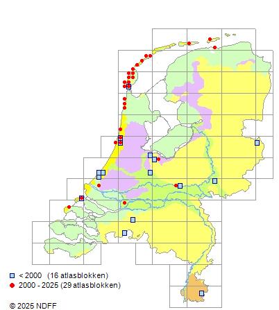 Het aantal atlasblokken (5x5 km) waarin de soort is gemeld binnen een periode van vijf jaar (vanaf 1980) of twintig jaar.