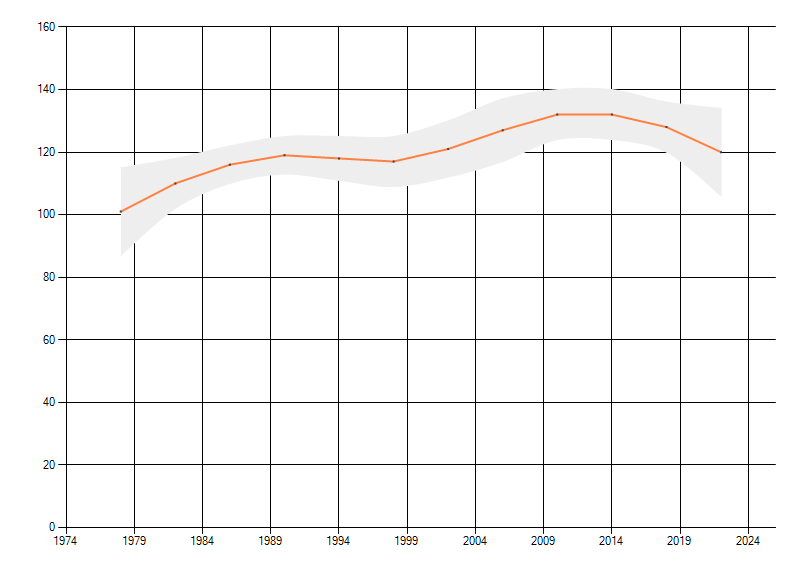 Gemiddelde trend van het aantal kilometerhokken waarin de soort voorkomt, weergegeven als indexcijfer (1975-1978 = 100).