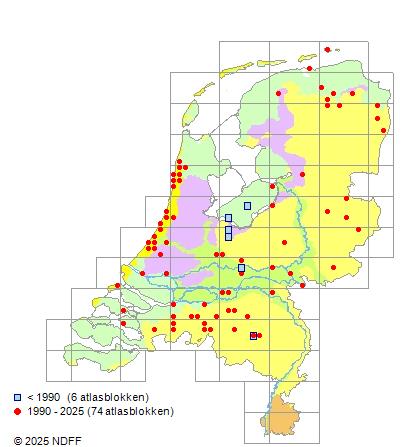 Het aantal atlasblokken (5x5 km) waarin de soort is gemeld binnen een periode van vijf jaar (vanaf 1980) of twintig jaar. Niet gecorrigeerd voor waarnemersinspanning en het aantal doorgegeven waarnemingen kan sterk variëren per periode, dus een trend in verspreiding kan hier niet direct uit worden afgelezen. Het opgegeven jaartal is het eerste jaar van de periode. Bron: gevalideerde waarnemingen uit de NDFF.