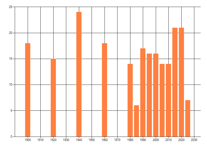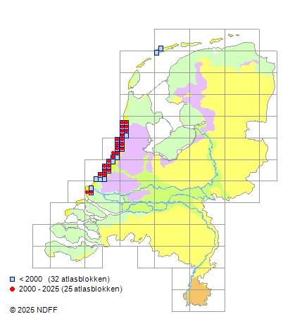 Het aantal atlasblokken (5x5 km) waarin de soort is gemeld binnen een periode van vijf jaar (vanaf 1980) of twintig jaar. Niet gecorrigeerd voor waarnemersinspanning en het aantal doorgegeven waarnemingen kan sterk variëren per periode, dus een trend in verspreiding kan hier niet direct uit worden afgelezen. Het opgegeven jaartal is het eerste jaar van de periode. Bron: gevalideerde waarnemingen uit de NDFF.